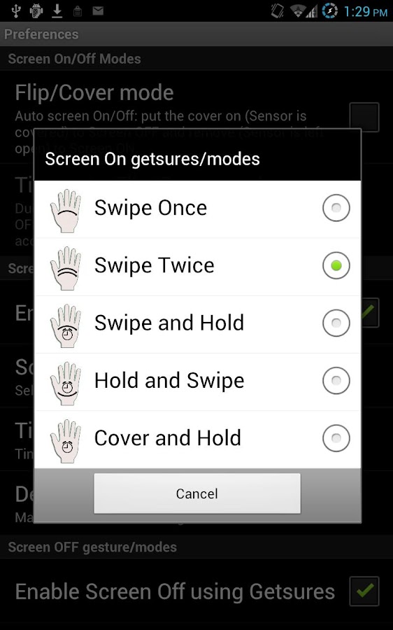 covered and ON when uncovered. (Feature requested by Galaxy Note users) • Turn Screen On/Off with following gestures: 1) Swipe Once, 2) Swipe Twice, 3) Swipe and Hold, 4) Hold and Swipe and 5) Cover and Hold • Ignore Apps list: Add the apps/games where you want to disable the service • Widget: to start and stop the service • ScreenOff shortcut: to turn off the screen by launching the app.