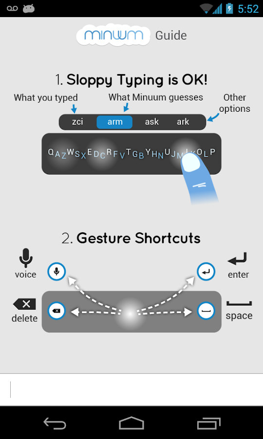 Bienvenido a Minuum, el pequeño teclado para dedos grandes! Minuum es un pequeño teclado, unidimensional que libera el espacio de la pantalla, mientras que le permite escribir rápido y con precisión. Escriba con rapidez sin tener que preocuparse acerca de ser precisa, gracias a la corrección automática inteligente.