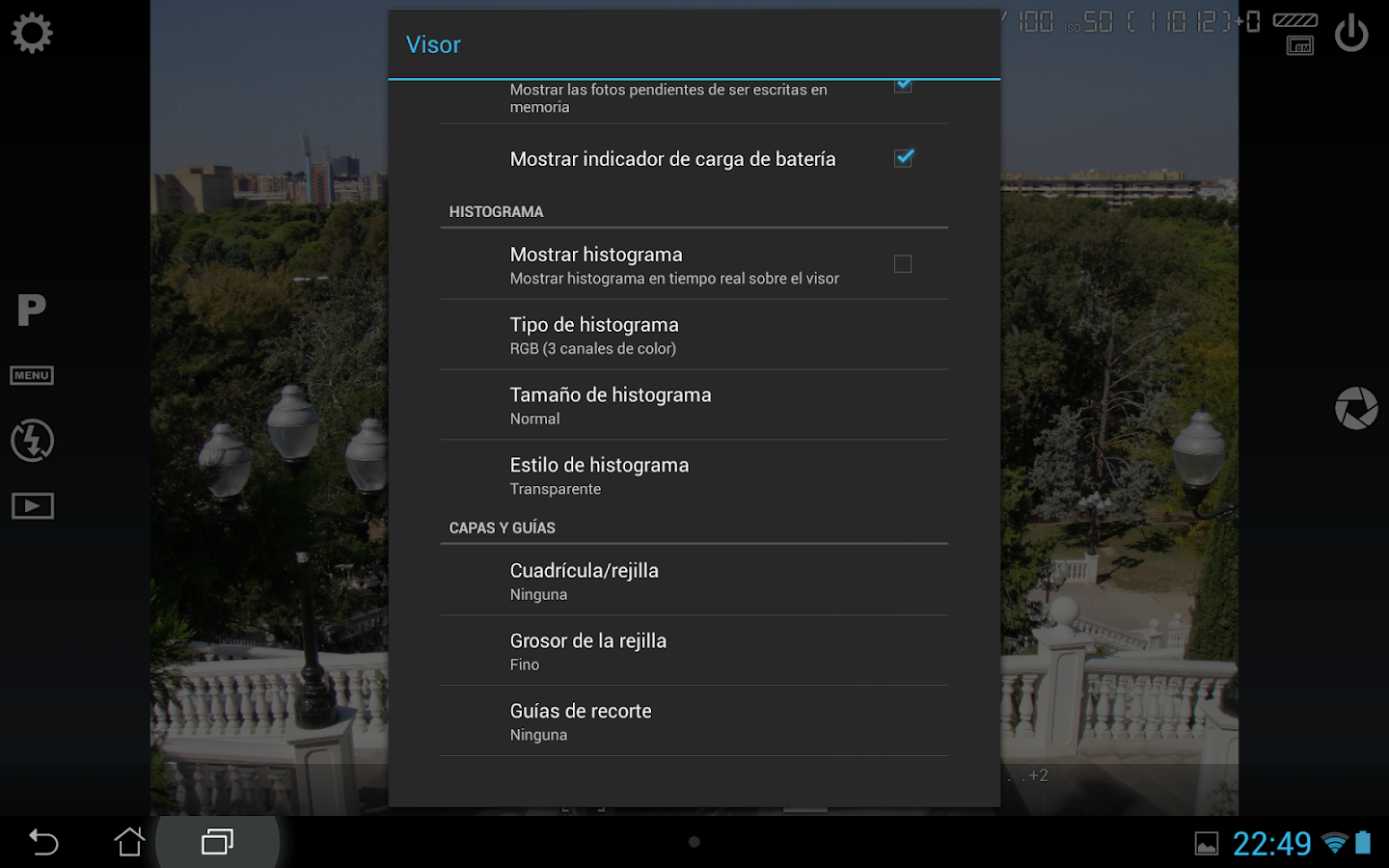 todos los parámetros fotográficos de la cámara y los controles están